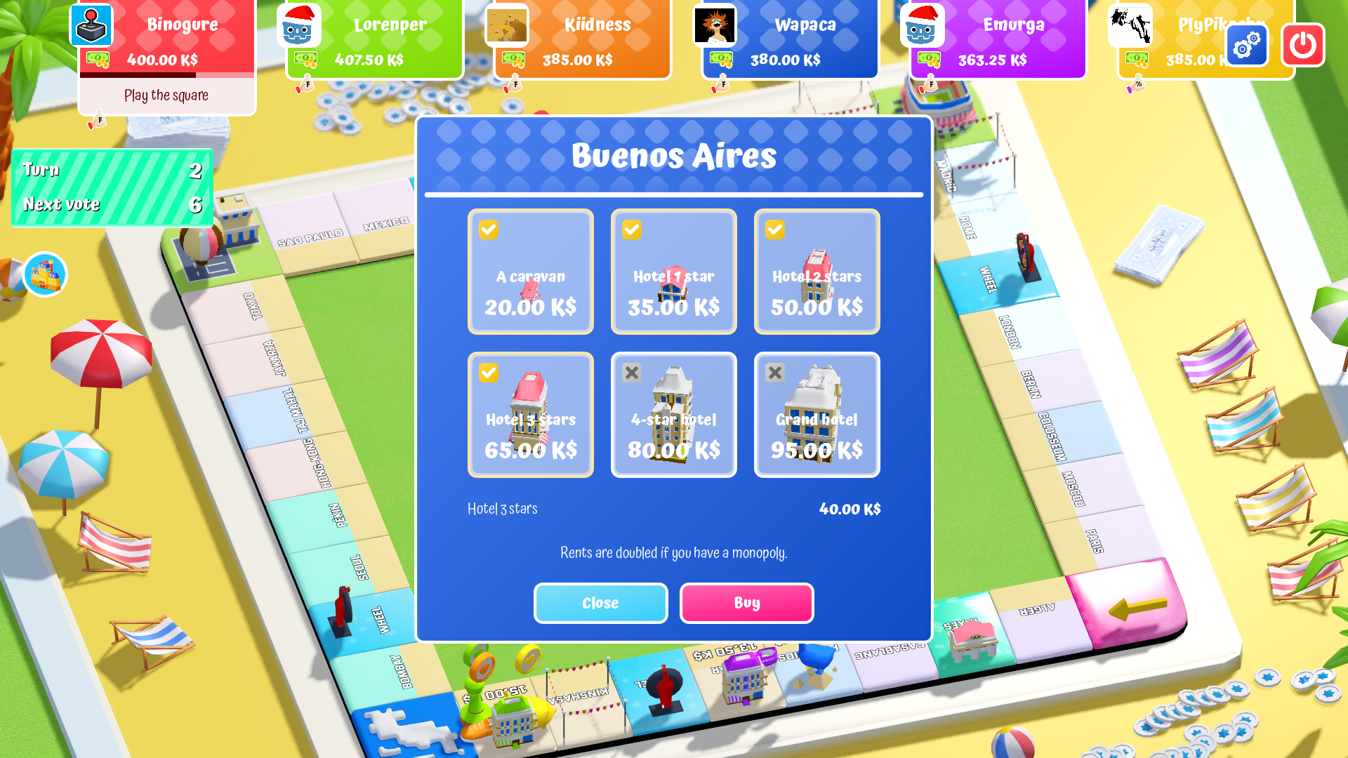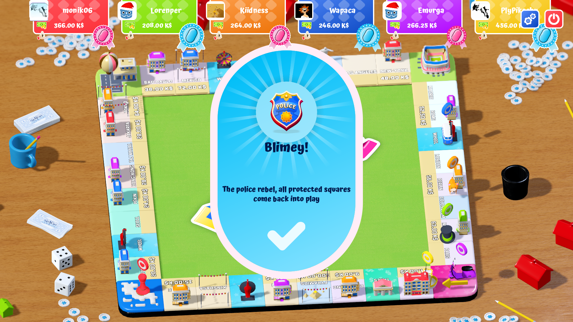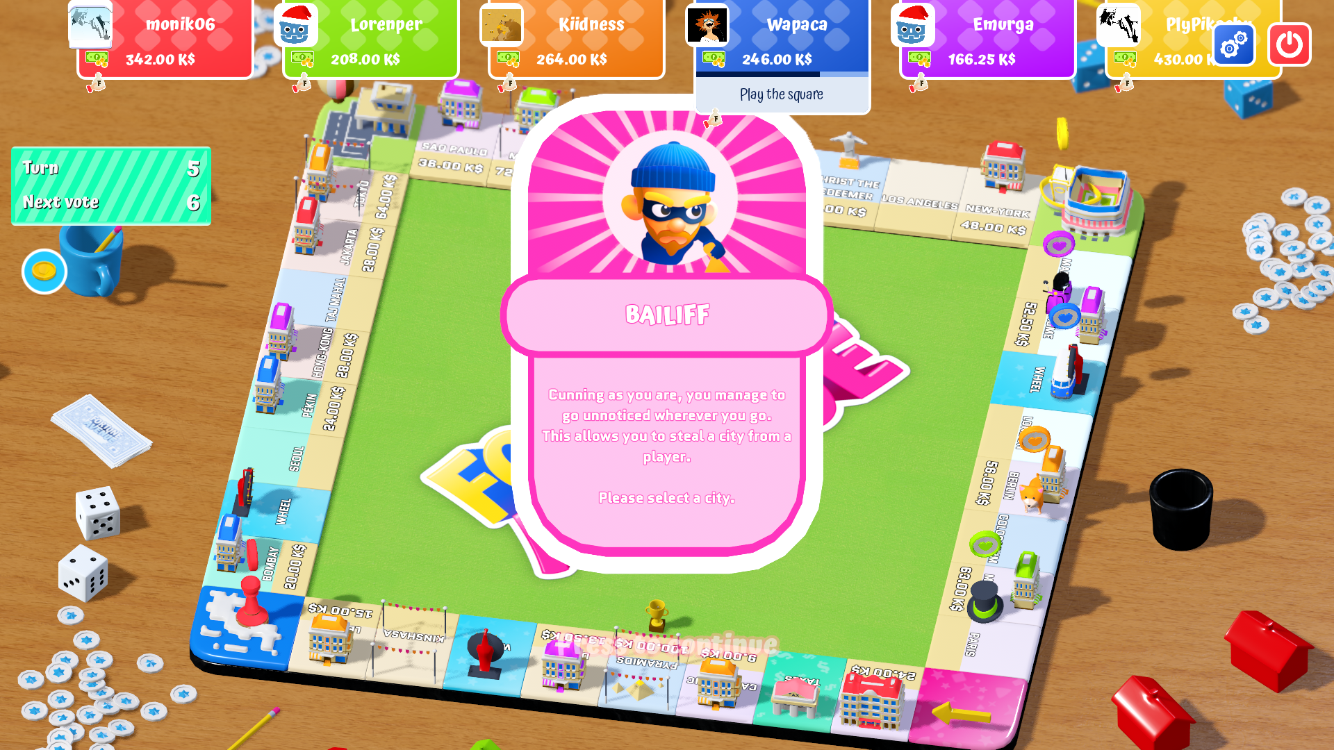 Ein Wettbewerbsspiel, in dem Spieler abstimmen, um ihr Schicksal zu formen. Verwandle Karawanen in 5-Sterne-Hotels, sammle Wunder und verdiene Kopfgelder, um Gegner in den Bankrott zu treiben. Nutze Flughäfen, um Rivalen auszumanövrieren, organisiere Weltmeisterschaften, um deine Miete zu vervielfachen. Kannst du dein Imperium in ein globales Monopol verwandeln?