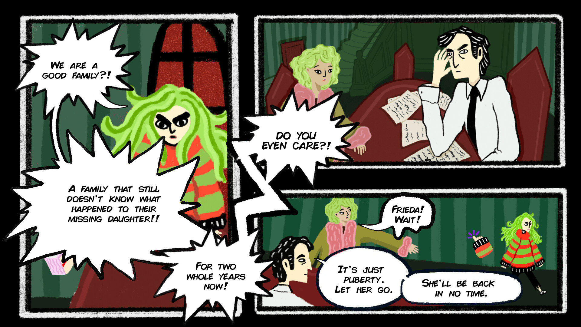 Frieda ist vierzehn, wütend und genug von Geheimnissen. Entdecke den wahren Grund für das Verschwinden deiner Schwester: Schnüffle durch ein abgelegenes Dorf, löse Rätsel und stifte Unruhe. Aber beeil dich - Monster lauern, wo du es am wenigsten erwartest.