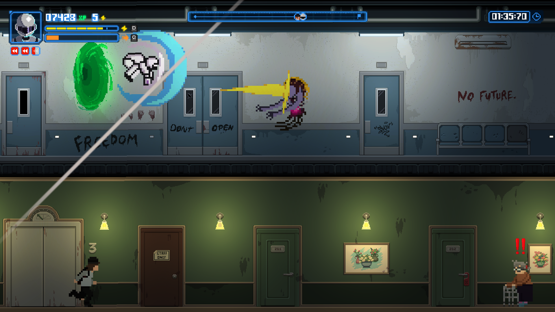 MIRAI #167 ist ein 2D Pixel-Art-Läufer, bei dem du gleichzeitig zwei Charaktere steuerst, die die Zeit zurückspulen und durch Portale springen können. Mach dich auf ein hektisches Abenteuer bereit, um die Menschheit in einer Welt zu retten, in der KI die menschliche Kontrolle übertrifft - verbessere deine Charaktere, brich Rekorde und schreibe die Geschichte neu, bevor es zu spät ist!
