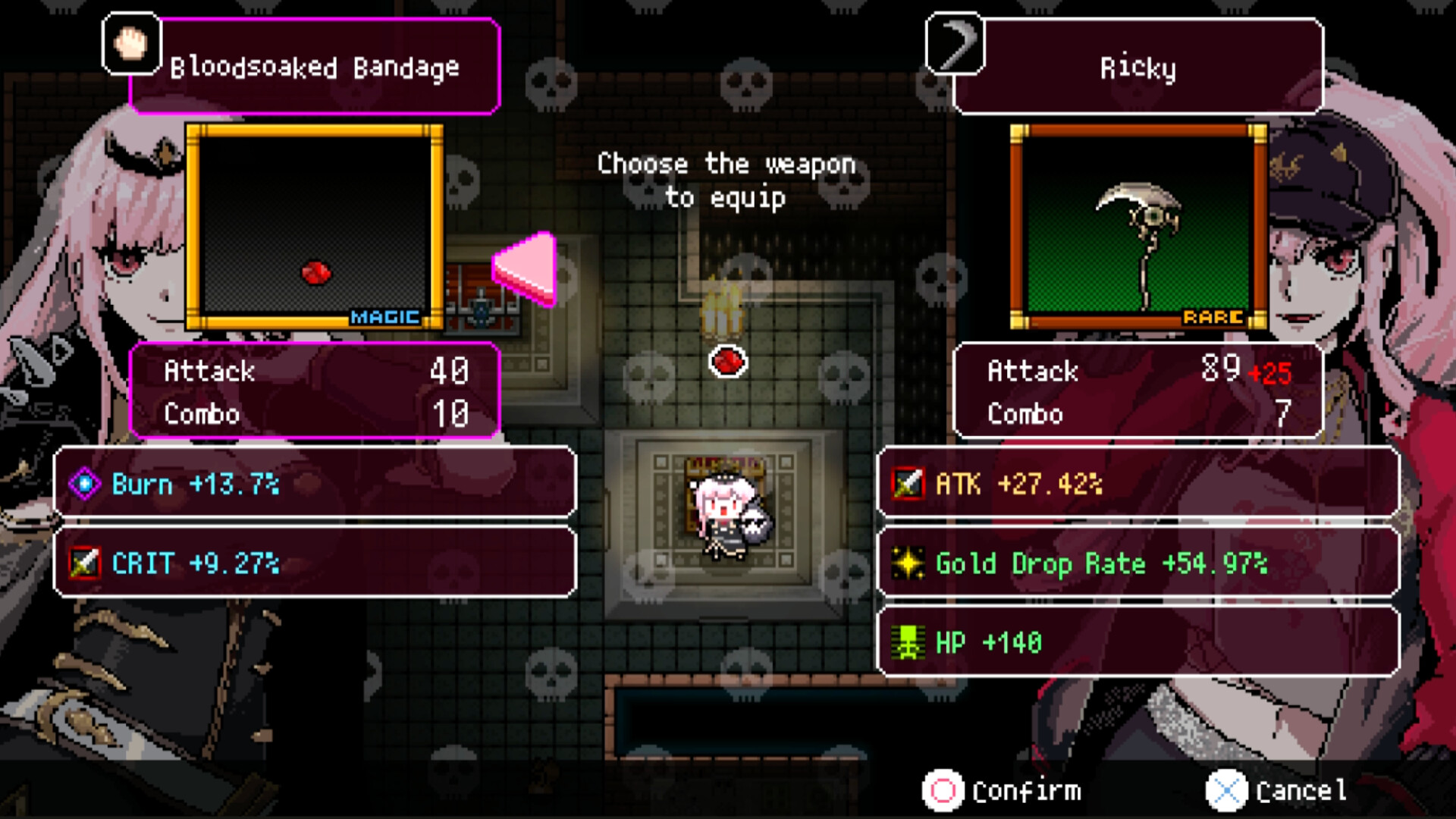 Besiege die Feinde, die sich dir in den Weg stellen, indem du verschiedene Waffen benutzt, die zufällig aus Schatztruhen im Dungeon fallen!