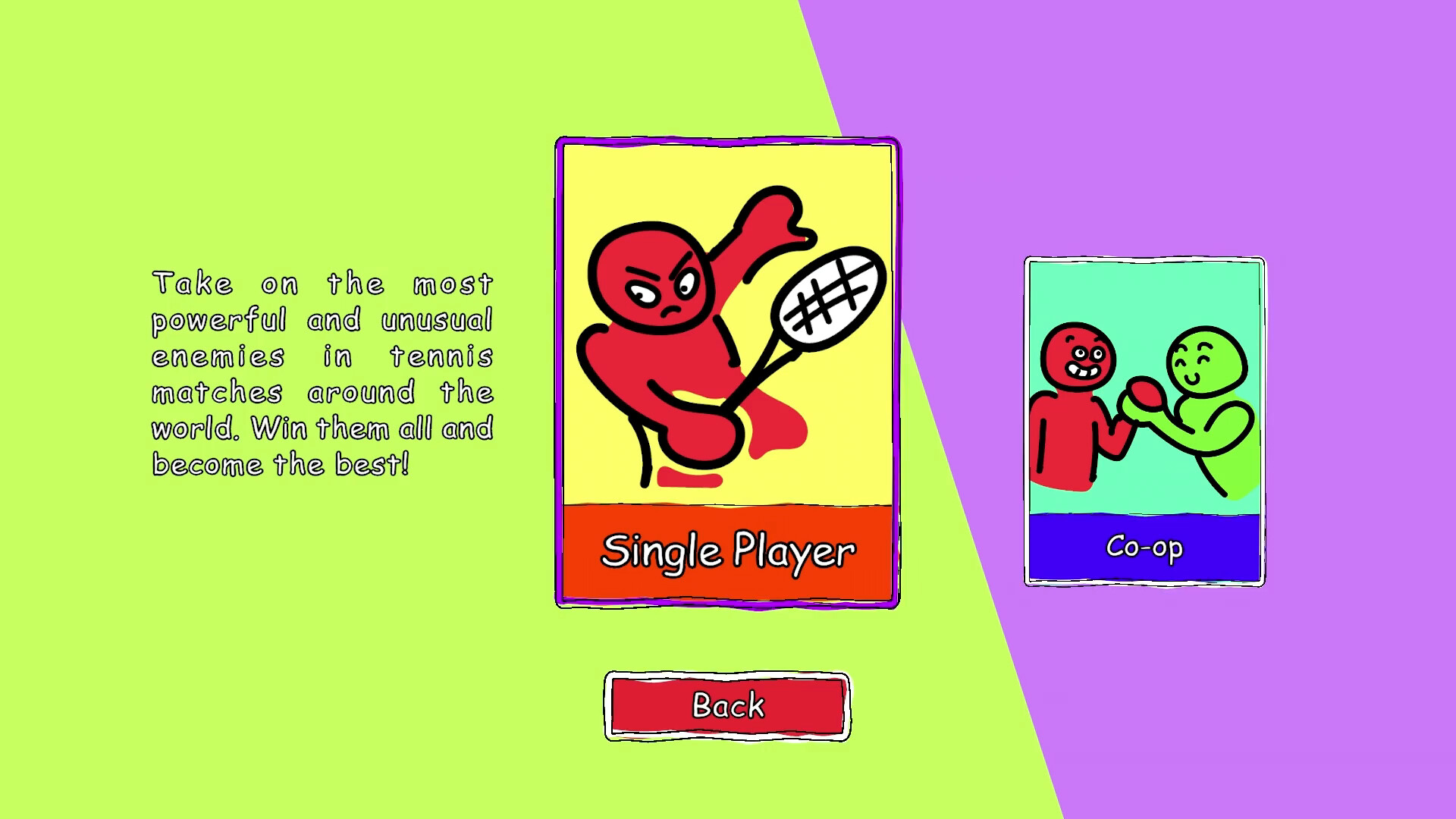 Stelle dich den unerwartetsten Gegnern in völlig verrückten Tennis-Matches. Gewinne Turniere, überwinde Hindernisse und besiege riesige Monster mit der Kraft deines Schlägers! Mach dich auf ein Solo-Abenteuer oder lade einen Freund ein, um die Welt des Quacolé Tennis in Doppel-Matches zu erkunden.