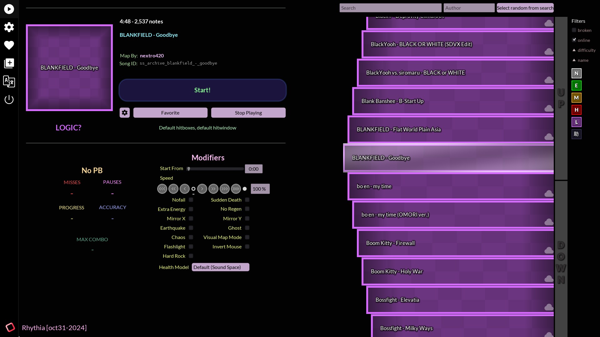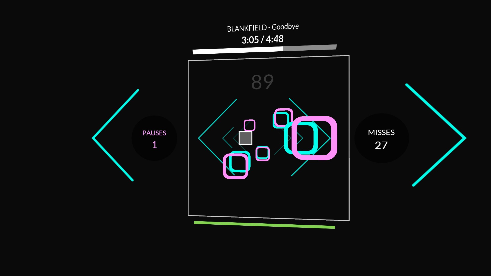 Rhythia ist ein Rhythmus-basiertes Spiel auf einem 3x3 Raster, bei dem du auf die Blöcke zielen musst, die auf dich zukommen. Du kannst es in der Egoperspektive spielen oder mit einer statischen Kamera.