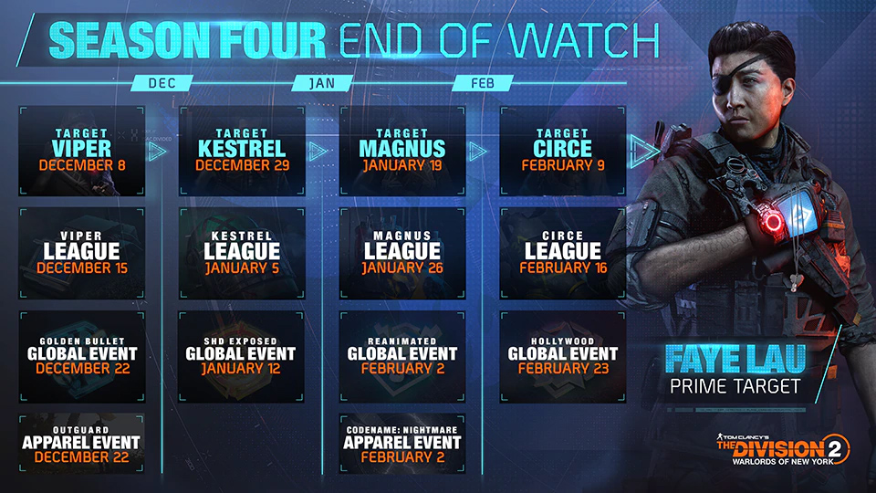 "End of Watch" ist die vierte Saison in Tom Clancys The Division 2. Diese Saison beinhaltet die Faye Lau Fahndung, vier Ligen, vier Globale Events, zwei Bekleidungs-Events und eine neue Missionsvariante.