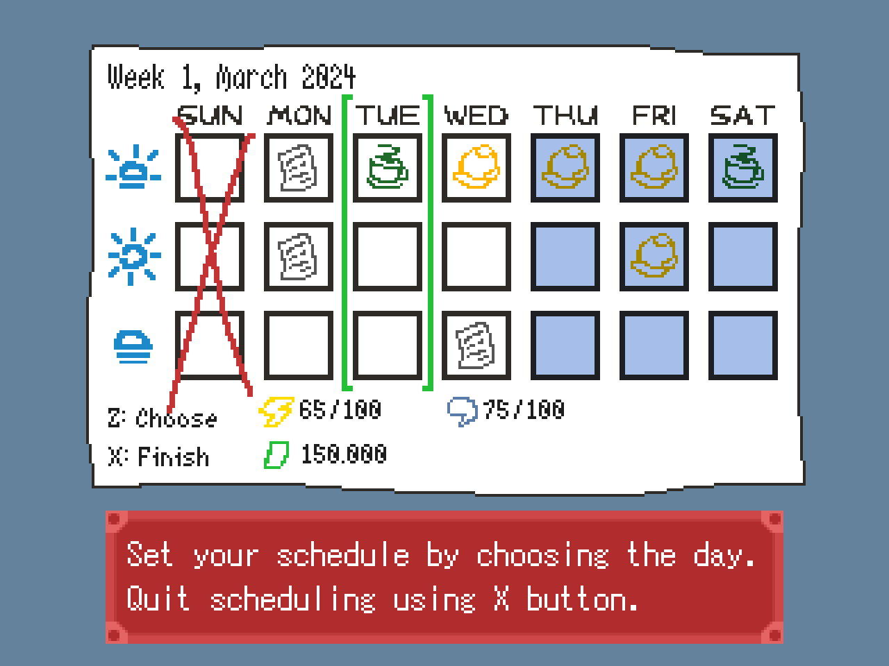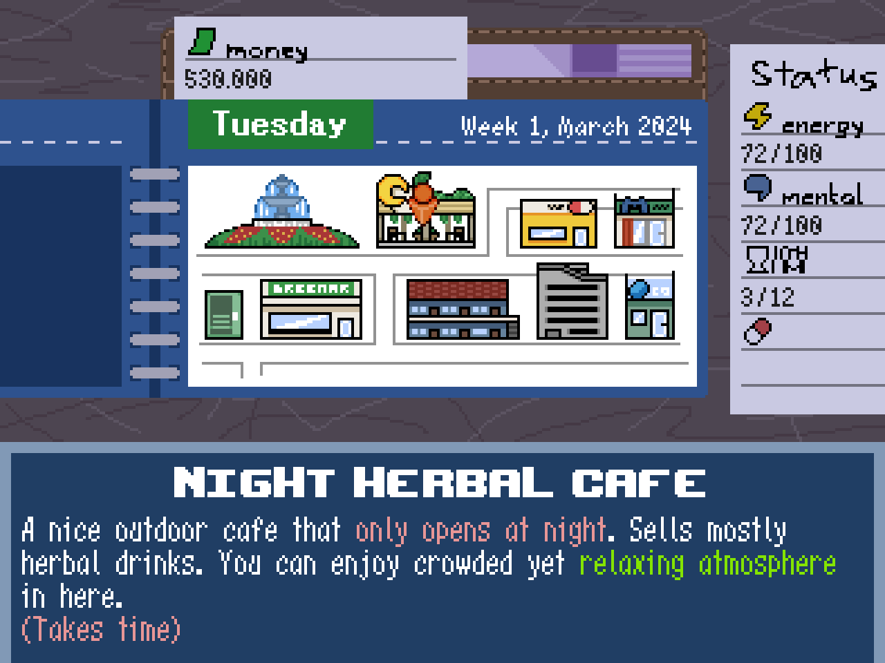 Ein Lebenssimulationsspiel, das mit RPG Maker 2003 (+ Maniac's Patch) erstellt wurde. Basierend auf einem Spiel, das für das RaiPGMaker 2025 Gamejam erstellt wurde, und stolz von Surabayans(??) mit Hilfe von Freunden bei Manusia Pagi entwickelt wurde.