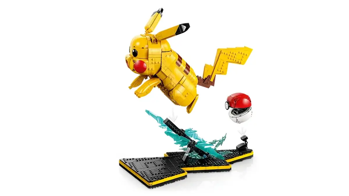 Eine Nummer größer fällt das Pikachu-Set inklusive Pokéball aus. Mit 2.050 Teilen richtet sich dieses Modell klar an erfahrene Baumeister. Aufgebaut erreicht das Set – inklusive Standfuß – eine stattliche Größe von 35 × 26 × 39 Zentimetern.
